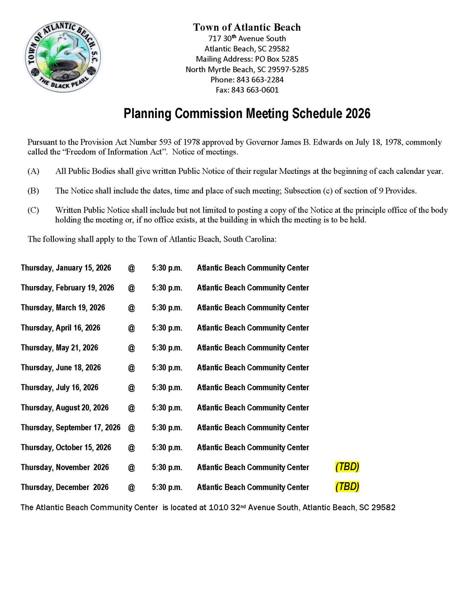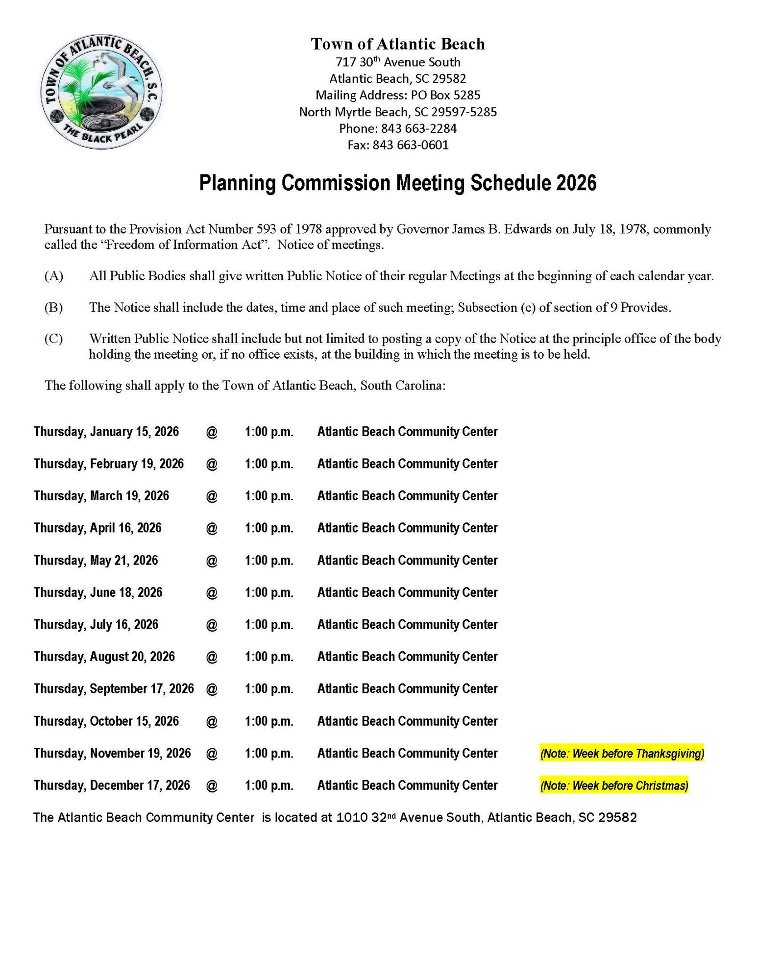 The Town of Atlantic Beach’s Planning Commission (or PC) serves a number of functions. It is an advisory board to the Town Council in that reviews and makes recommendations on zoning and land development text amendments, as well as zoning map amendments. It is the decision making body for major subdivision plats, street naming, and public project review. It hears appeals to administrative decisions arising from the Land Development Regulations section of the Land Management Ordinance, and can issue design modifications to the requirements of the LDR. It also oversees and participates in the development of the Comprehensive Plan as well as the Zoning Ordinance and the Land Development Regulations, and makes recommendations to the Town Council for and changes or amendments to those documents.